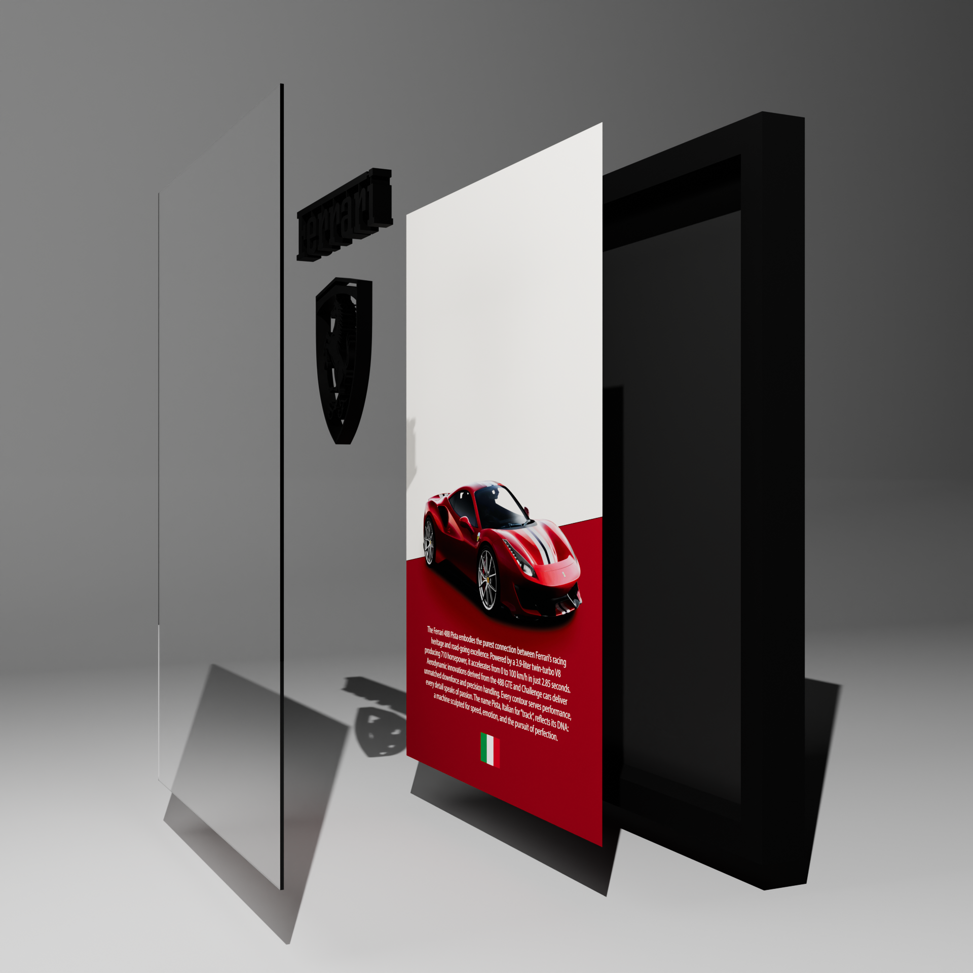 A celebration of Ferrari’s racing spirit, this handcrafted 3D frame captures the raw performance and aerodynamic beauty of the 488 Pista. Born from the 488 GTB and refined through Ferrari’s motorsport legacy, it embodies speed, precision, and Italian excellence. Designed for those who admire power with purpose, it stands as a tribute to engineering perfection and the relentless pursuit of performance.